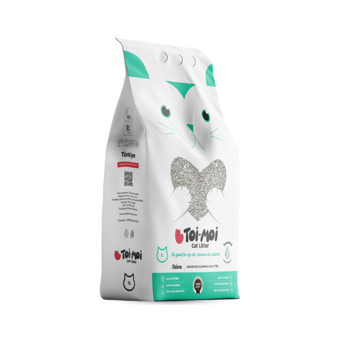La arena sanitaria Toi Moi Natural elimina los malos olores de forma natural y cuenta con un 99,8% libre de polvo. Su alta capacidad de absorción permite formar aglomerados rápidos y firmes, manteniendo la caja seca y limpia. No se dispersa ni se adhiere a las patas, facilitando su limpieza y ofreciendo un uso económico. Libre de químicos dañinos, protege la salud de tu gato y de tu hogar. Elaborada con bentonita natural extraída de fuentes sostenibles, es una opción segura y respetuosa con el medio ambiente.